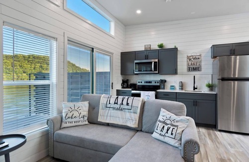Check out this brand new Floathouzz right on beautiful Lake Cumberland! The Gray Tiny XL can sleep the entire family, friends and more! On the main level you have a full kitchen, living room with tv and sleeper sofa, master bedroom with a kind bed and master bath, and a secondarily bathroom. On the lower level you have 2 bedrooms each including 2 queen size beds. The loft is the perfect place for all the kiddos featuring 3 queen beds and a twin bed!