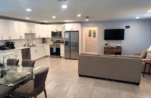 Spacious 3Br/2Ba ~ Pool and Lounge! *New Pool Heater Added January of 2025* This home features a King Master Suite. The spare King Bedroom and spare Twin Bed bedrooms have a shared Bathroom. Complimentary shampoo and body soaps are provided to our guests. There is a large open Kitchen, Living Room, and a separate family lounge with pool views. This split plan offers privacy for the master and the two additional bedrooms, perfect for couples or any multi-family arrangement. Enjoy the spacious fenced yard and grill!