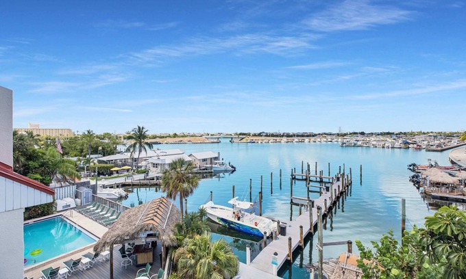 Bring friends and family to this updated 1,350 sqft waterfront corner condo in historic downtown Key West! Just 1 mile to Duval St, the Seaport, and Hemingway House. Enjoy on-site boat slips, heated pool, tiki bar, BBQ grills, parking, elevator, and secure keyless entry. Fish cleaning station and commercial ice machine available. Large park with tennis courts next door. Walk or bike everywhere—only 10 minutes from EYW airport!