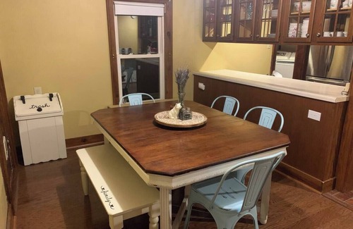 Fly Creek Manor has 4 bedrooms and 2 bathrooms. The master bedroom is downstairs and has a king bed. The remaining 3 bedrooms are upstairs, 2 have queen beds and 1 has two full beds as well as a bean bag that converts to a spare king sized bed (CourdaRoy’s brand). An air mattress can also be provided if this is more comfortable to use. With all these beds including the spare CordaRoy bed or air mattress the house comfortably fits 12. There is one bathroom upstairs and one downstairs. Both has walk in showers, no tubs. There is a dedicated work space with a desk and there is Spectrum WiFi provided. The living room has 2 couches that will each seat 3 people and a TV set up for streaming such as Netflix, Disney Plus and Amazon Video. There is a full kitchen with everything you need to cook during your stay. There is a lovely large washer and dryer as well to use! Outside is a private yard with a charcoal BBQ and a fire pit. Fly Creek Manor is so cute and cozy you won’t want to leave! We have left all the charm that makes it an 1800s home but still providing all the amenities needed to have a wonderful and cozy and relaxing stay!