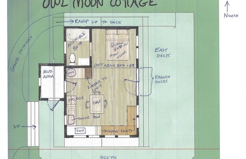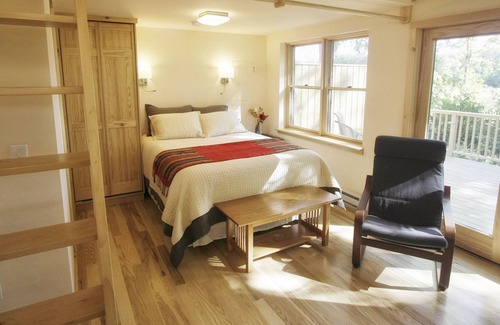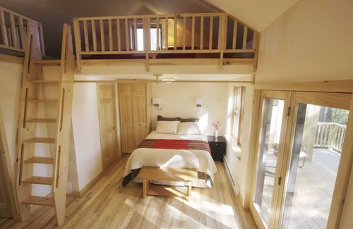 Owl Moon Cottage is wheelchair accessible and features a fully equipped kitchen with handcrafted cherry cabinets, locally milled hardwood floors, a luxurious queen bed, tiled bath, and super spacious deck. The loft area accommodates two guests (age 7 or older), either in two twin beds or a King.