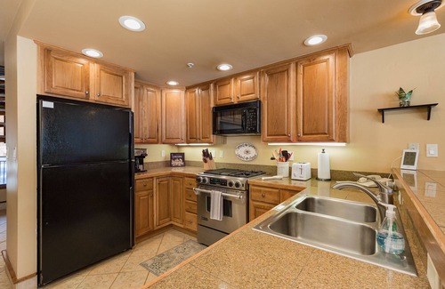 Step inside and enjoy the cozy living area with a gas fireplace. The fully equipped kitchen has everything you need (full-size fridge, gas range, dishwasher, microwave, toaster, and drip coffee maker) while the dining area offers both table seating and breakfast bar options for easy meals together.
