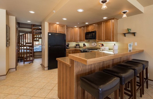 Both levels feature full bathrooms for added convenience, with an extra vanity upstairs. The private deck offers plenty of cushioned seating and an electric grill. You’ll also find a dedicated workstation with a WiFi extender for those who need to check in remotely (100+ Mbps speeds), plus a washer/dryer and exterior storage closet for skis, clubs, or gear.