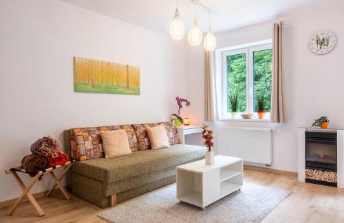A recently renovated apartment, Forest Apartment with Sauna offers accommodations in Jáchymov. With garden views, this accommodation provides a balcony. There's a terrace and guests have access to free Wifi, free private parking, and an electric vehicle charging station. The apartment consists of 1 bedroom, a living room, a fully equipped kitchenette with a dishwasher and a coffee machine, and 1 bathroom with a bidet and slippers. Towels and bed linen are provided in the apartment. There's also a seating area and a fireplace. Sightseeing tours are available within easy reach of the property. Skiing and cycling are possible within the area, and the apartment offers ski storage space. Fichtelberg is 7.4 miles from Forest Apartment with Sauna, while Hot Spring is 13 miles away. Karlovy Vary International Airport is 16 miles from the property.