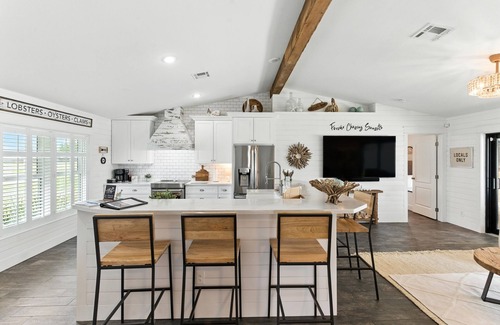 Inside, you’ll find an open-concept living area filled with natural light, chic shiplap walls, and thoughtfully curated coastal décor. The spacious living room features a large smart TV, plush seating, and direct access to the covered patio and pool area.