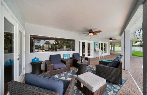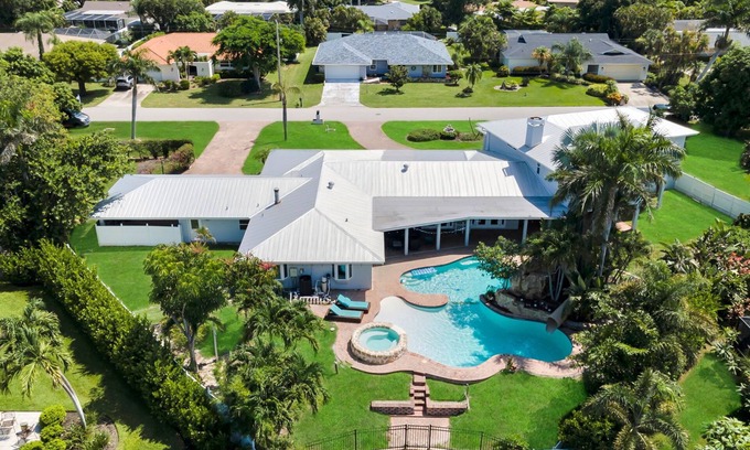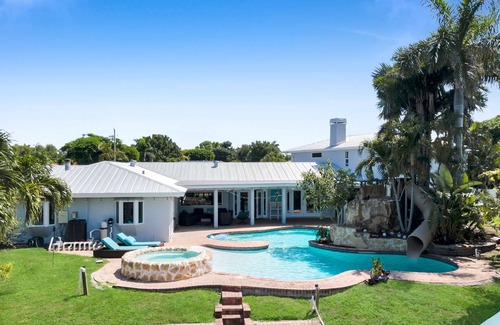 Enjoy the ultimate Southwest Florida vacation in this luxury 4-bedroom, 5-bathroom waterfront home located in the prestigious McGregor Boulevard area of Fort Myers. Perfect for families and groups, this spacious retreat features a private heated pool with a waterslide, hot tub, outdoor dining area with grill, and direct Gulf access, bring or rent a boat and be on open water in minutes. Inside, you’ll find four comfortable bedrooms, each with its own en-suite bathroom, sleeping up to 12 guests. The home offers a fully stocked kitchen, smart TVs, fast Wi-Fi, washer and dryer, and a fenced backyard ideal for kids and approved pets. Just a short drive to Fort Myers Beach, Sanibel Island, and local attractions like the Edison & Ford Winter Estates and Downtown River District, this home combines comfort, convenience, and fun for a memorable Florida escape.