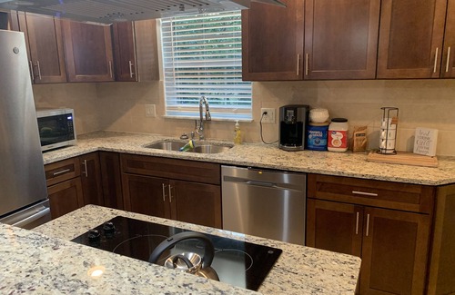 This home is modern and very relaxing with an open floor plan. The living room has a large flat screen smart tv, electric fireplace and a large window to bring in tons of sunlight. The kitchen has plenty of cabinets, a lot of granite counter space with stainless appliances that include refrigerator, oven, dishwasher, electric stovetop with overhead exhaust and microwave. The dining room has a oval table that seats six with a large window providing plenty of sunlight. The top floor also has two bedrooms. One bedroom is large with a queen bed, deep walk-in closet and a large window overlooking the back deck and wooded scenery. Another bedroom is slightly smaller with two closets and a large window looking out to the front of the house. The lower level has a large master bedroom with three closets and an attached custom bathroom with a very large walk-in shower. The family room has a large flat screen smart TV with two sofas and ottoman, a dry bar and patio doors that walk out to the large deck. This home also has a laundry room with a washer and dryer.