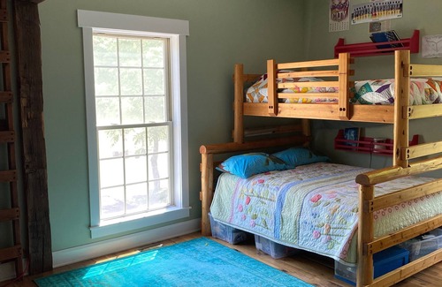Several bedrooms feature antique hand hewn barn timbers supporting lofts. Every kids dream space, but adults love it too. Don't miss the "Hobbit Loft" connecting three bedrooms.