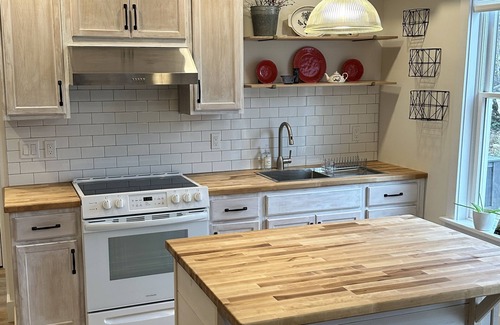 The Foundry Guest Apartment is on the first floor of a newly renovated Historic Grange Hall. The Foundry property, in addition to a couple of second floor apartments, is also an Artist's glassblowing and sculpture studio in an adjacent building. Our Guest Apartment is close to the coastal towns of Camden and Rockland.