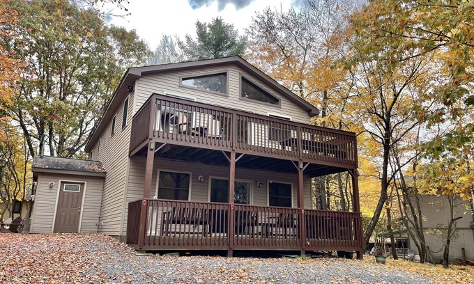 Four Seasons Vacation Home By Lake, HOT TUB, WIFI,BEACH passes, Canoe, FIRE PIT | Ski Chalet in Lake Harmony