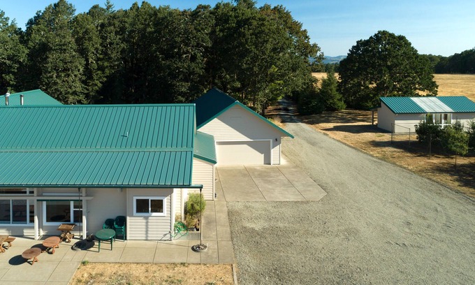 This is a 55 acre slice of heaven with an incredible view of Oregon Coast Range. Spacious 3100 sq ft. house, 3 bedrooms ea. with own full bathroom, plus 2 extra 1/2 baths. Sleeps 9. Gourmet kitchen, large living & dining room space. Lots of wildlife, but you'll need to see for yourself! Owners take great care to make your stay a comfortable one. Depending on when you stay, you may see farming activities. Ring Doorbell is onsite.