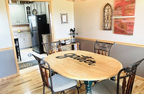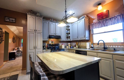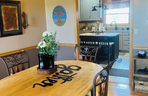Fox Haven farmhouse is designed to comfortably sleep 10. Choose to enjoy a fully equipped kitchen, show off your grilling expertise, or have pizza delivered and enjoy the outdoor patio furniture or the indoor dining room and kitchen bar seating.