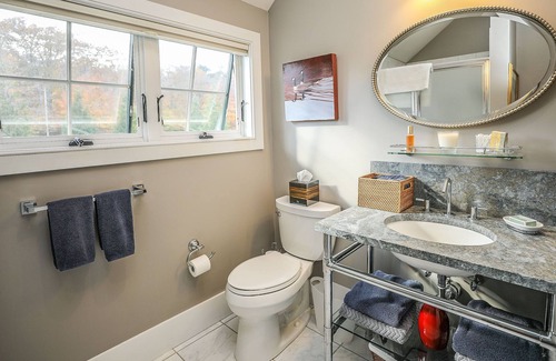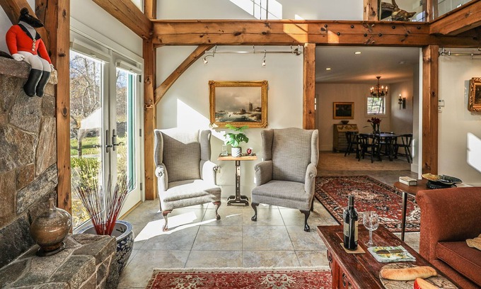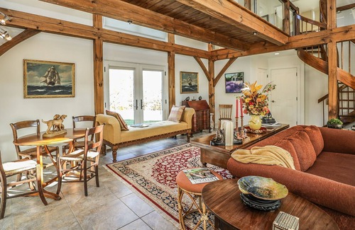 The Fox and Moose is a post and beam constructed home centered around a vaulted living room. Two ensuite bedrooms are on the second floor. Move between levels using an elevator or spiral staircase, and between the suites using a floating walkway. The gourmet kitchen with eat in dining space opens to a covered patio with sweeping views of Pack Monadnock and your own private garden with a pond, pergola and firepit. The main floor has a a half bath and is connected to the car garage.