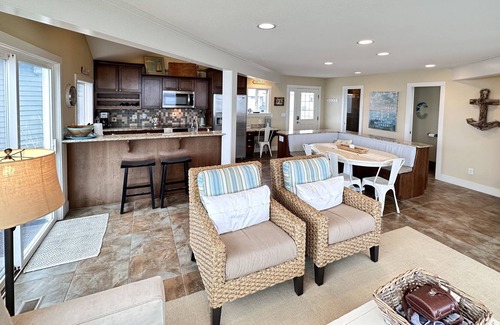 The family room is comfortably furnished, including a large dining gaming table, flat screen cable TV and strong Wi Fi. The kitchen is well appointed with plenty of dishware, glasses, and cooking equipment and utensils. The primary king bedroom shares the same amazing view as downstairs. The second bedroom offers a queen bed and a set of bunks. Perfect for a family vacation or couples getaway!
