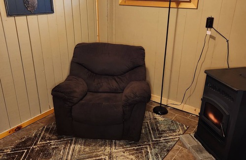 This is a three-bedroom camp. Downstairs are two rooms with queen size beds and a lounge area with a recliner next to the pellet woodstove. The kitchen, living room, dining room are located upstairs along with the third bedroom that has bunkbeds. Both floors offer a bathroom. The living room also has a pellet stove. The ¾ wrap around porch offers outdoor seating with a propane grill and a large covered and screened in area with a tv. Have a fire in the outdoor fire pit. Camp is located about 2 miles from beach area.