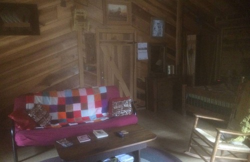 Staying at the Pioneer Room will take you back to days gone by! ITs a large one room unit and all the paneling is Tulip Poplar wood which we logged off our property and is the same type of tree the Pioneers would use for their first log home! The queen bed is made from recycled train tracks and old farm homes. There are pictures of covered wagons, Native Americans, parts of old tools and harness........great way to test your knowledge of times gone by. There is a futon which makes a full bed, so the Pioneer room easily will sleep up to 4 people, If you have more than 4 people please bring MATS and Sleeping bags. There is floor space for extra kids. Kitchen is fully equipped ( bring own food/paper towels) , air /heat or just open windows, smart tv and vcr with movies, private bathroom with tub jaccuzi and shower and private entrance with rockers to relax!