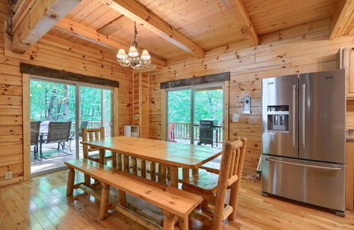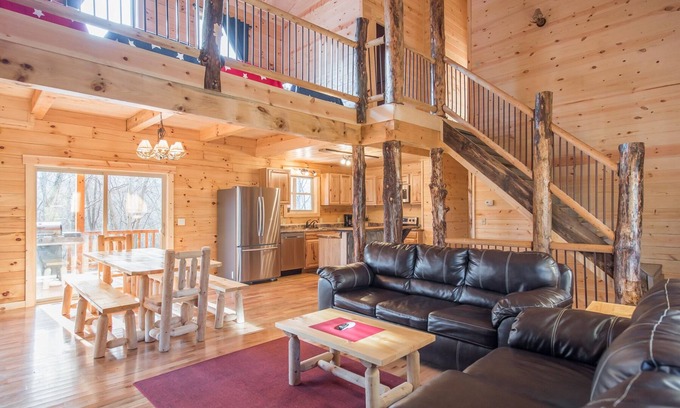 Freedom Lodge offers a peaceful escape surrounded by nature, perfect for families looking to slow down and reconnect. With 4 bedrooms and an open loft with twin beds, there's plenty of space to spread out. Gather in the airy two-story great room, cozy up by one of the stone fireplaces, or challenge each other to a game of pool in the finished walkout basement. Outside, dine among the treetops on the spacious decks, relax in the hot tub, or end the evening with stories around the fire pit while the stream flows quietly nearby.