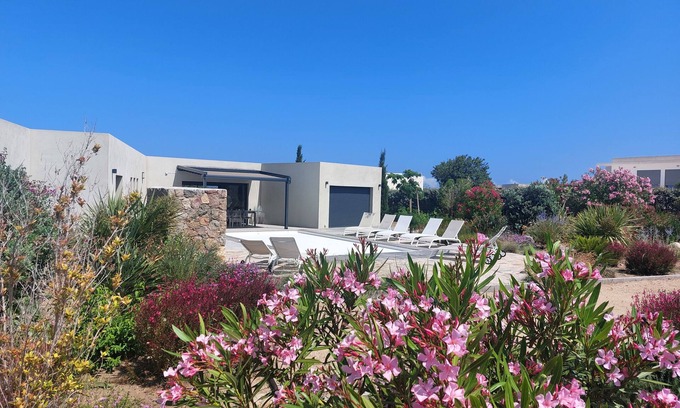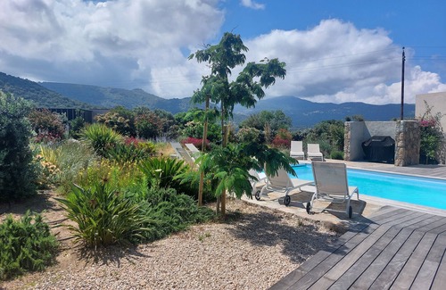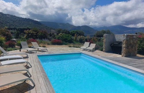 Single storey villa of more than 250M2 (including 80M2 of terraces), the Frelmacasa residence is ideally located 5 minutes from all amenities (white sand beaches, Ile Rousse and its shops, medieval villages of Pigna and Sant'Antonino, 20 minutes from Calvi airport). Classified 5 stars, it consists of 4 spacious rooms, each equipped with hotel quality bedding, a bathroom and a smart TV. The through living room of the house brings together the living room, kitchen and dining room to create an airy and friendly space to meet. The kitchen is fully equipped: oven, microwave, large refrigerator, dishwasher, hob, wine cellar. Air conditioning in all rooms and pergola will allow you to best manage your room temperature. Outside the house you will find a heated and secure swimming pool with a depth of 1m40 over its entire area. the deckchairs arranged around the pool will allow you to enjoy the Corsican sun. You will also find a barbecue-plancha, a large dining table, a petanque field and a garden. Possibility of an optional 5-seater vehicle (Dacia Sandera Stepway) at a price of 300€/week with rental at Bastia Poretta airport