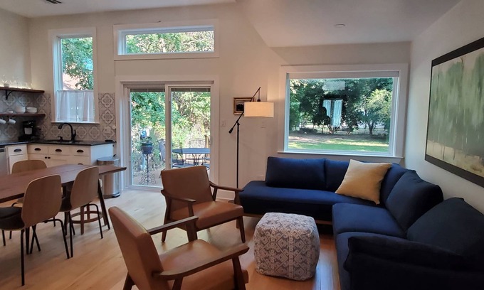 The living/ kitchen is open and airy with 11' ceilings and large windows that offer peaceful views to towering trees. Plus, a large deck provides a lovely space for entertaining. We are just blocks from downtown, yet you'll find the home relaxing, and peaceful.