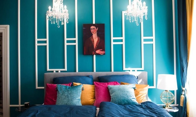 Relax on a powder blue sofa in an elegant room where a crystal chandelier hangs from a high ceiling. Each room is decorated with unique and luxurious elements—especially a green-and-white bedroom with numerous portraits of the artist Frida Kahlo.