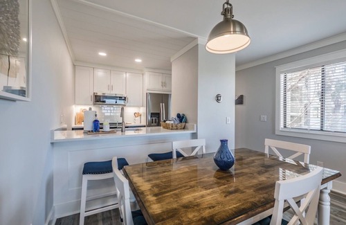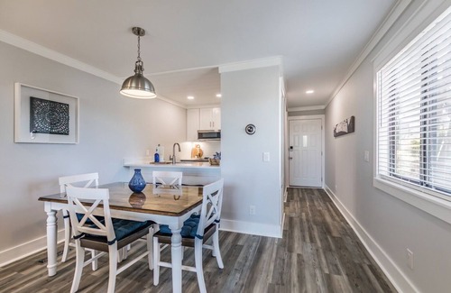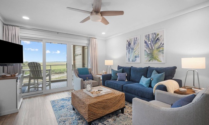 "Fripper Upper" is a COMPLETELY and TASTEFULLY RENOVATED (end of 2021) 1 king bed/1 full bath FIRST FLOOR CORNER villa with INCREDIBLE marsh, canal, and sunset views! The current owners purchased at the end of 2020 and spent all of 2021 making the entire villa new, bright, light, and airy. 2025 introduced a new, improved, and slightly larger screened back porch, a new 3-panel slider glass door, a new rear bedroom window, a new back door, new hardie-plank on the back exterior wall, new subflooring, and fresh interior paint throughout most of the condo. EVERY window allows plenty of light while highlighting the beauty and splendor of the marsh, wildlife, and Mother Nature. NO PARKING LOT OR STAIRCASE VIEWS - ALL MARSH VIEWS! NO STAIRS TO THE BEDROOM! (once inside, it's all one level - no hauling luggage up stairs to a bedroom). The beach/ocean, adults-only pool and Sandbar, Island Bites food court with food trucks on The Beach Club Greene, Olympic swimming/lap pool, Island Arcade, gym/fitness center, The Resort's Fripp Ship and Salt & Sea Mercantile souvenir/clothing stores, and the heart of Fripp Island are just across the street, with MULTIPLE BEACH ACCESSES too!