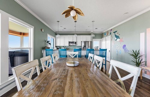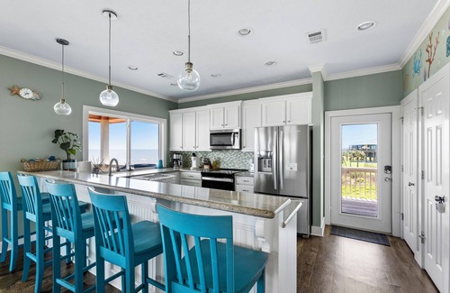 The coastal charm doesn’t stop with its scenic front-row view of the Gulf framed by nearly every window – this beachfront haven is thoughtfully decorated so every corner feels like a seaside retreat. This one-of-a-kind Crystal Beach home features a hand painted Ocean Life mural by a local artist, as well as a custom designed neon photo wall, where you can pose for gorgeous family pictures (and selfies!) to memorialize your vibrant vacation, in addition to the endless number of candids you’ll capture amid memorable moments at this picturesque Airbnb!