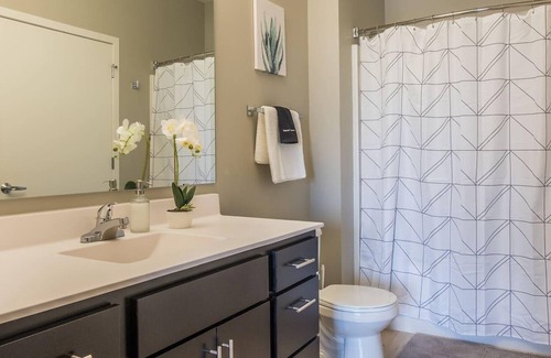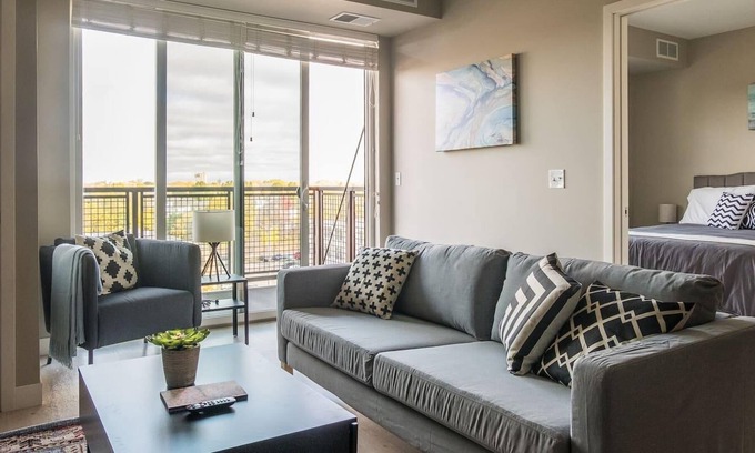 Our modern 1-bedroom apartment is furnished with everything you need for a comfortable stay! The kitchen is stocked with cookware to cook simple meals, stainless steel appliances, and a Keurig to enjoy a fresh cup of coffee in the morning.