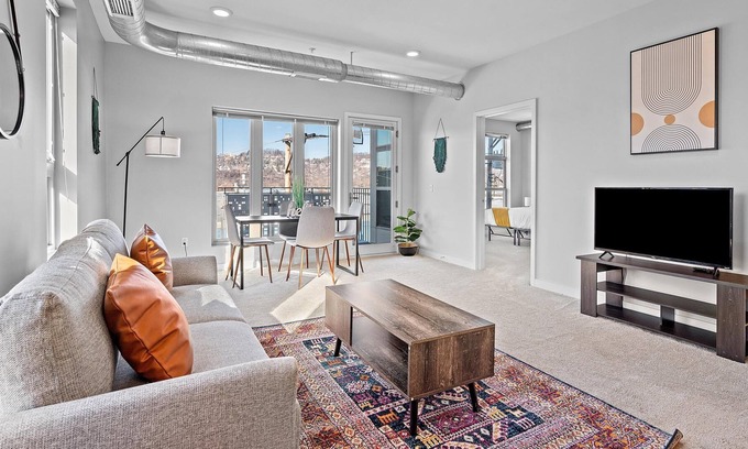 This luxurious two-bedroom apartment blends the excitement of the city with the comfort of small town living. Located in the Lawrenceville Neighborhood and just minutes away from Downtown Pittsburgh, everything you need and want are just minutes away from your doorstep. The kitchen is adorned with stainless steel appliances, a Keurig coffee maker, and basic cookware to cook simple meals for a cozy night in! Our suite also features a balcony with wonderful views for your enjoyment. A washer and dryer are included in the unit for your convenience. There's even free Wifi!
