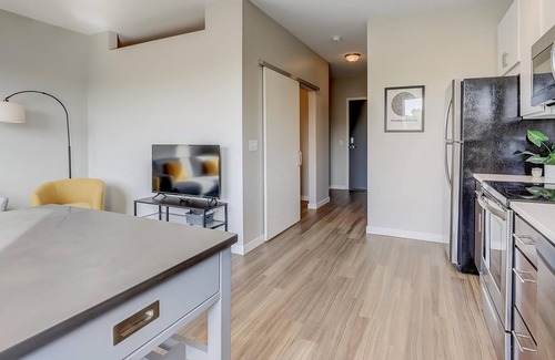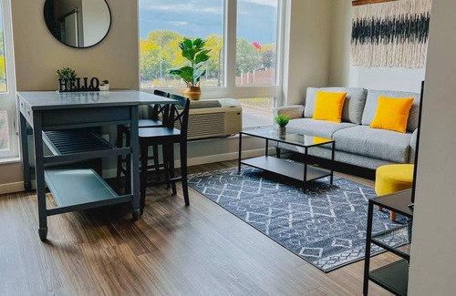 This studio apartment has everything you & your guests need to enjoy your stay in Minneapolis! The bedroom has a sliding door that can be closed, but one of the walls does not reach the ceiling at the top and is open to the living area (see photos). In the kitchen, you'll find beautiful appliances, a Keurig coffee maker, and basic cookware to cook simple meals for a cozy night in! There's free WiFi!
