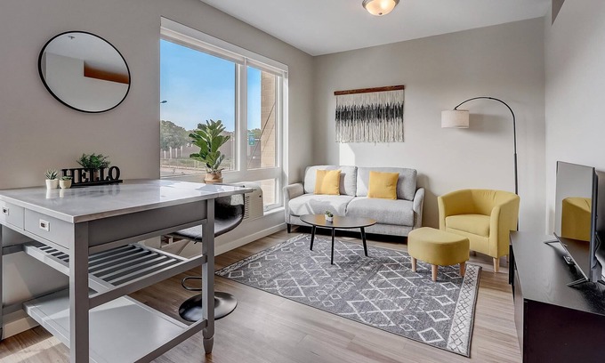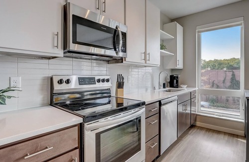 This studio apartment has everything you & your guests need to enjoy your stay in Minneapolis! The bedroom has a sliding door that can be closed, but one of the walls does not reach the ceiling at the top and is open to the living area (see photos). In the kitchen, you'll find beautiful appliances, a Keurig coffee maker, and basic cookware to cook simple meals for a cozy night in! There's free WiFi!