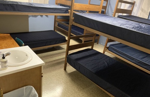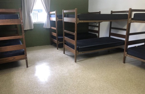 Found in the farthest reaches of our 350 acre property is set a wonderful rustic lodge full of rich history. With a twist of new construction next door providing a mixture of the Past and the future ahead. Included in this rental is the frontier lodge equipped with with a full industrial kitchen with large gas stove, refrigerator, Microwave and deep commercial sink, also included in the rental are dishes and utensils needed to make meal during your stay. Separated from the kitchen by a large functional counter space (perfect for meal service) is the open dinning/living area with a beautiful fire place, perfect for a cozy night time fire. Also included in the rental rate is the use of our tables and chairs able to seat 40 persons. The frontier lodge also has two full bathhouse style restrooms with three stalls, two showers and four sinks on each side. (boys side has two toilets one urinal). Next door to the frontier lodge are the sleeping accommodations for your stay. The Frontier Bunk house is a modern block cabin with 4 bedrooms, each able to house up to 8 people bring the total sleeping accommodation ability to 32. Guest must bring their own bathroom and bedroom linens along with shampoo, soap, etc.
