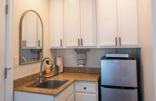 The kitchenette is thoughtfully equipped with a dorm-sized fridge, cabinetry, and a double glass induction hot plate. You'll also find an air fryer, toaster oven, cookware, a few pots and pans, and all the essential utensils, perfect for preparing simple meals during your stay.