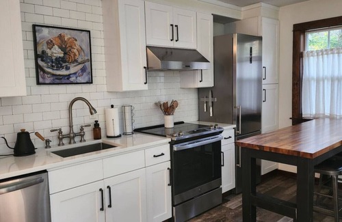 The fully equipped kitchen features stainless steel appliances, white cabinetry, and a beautiful subway tile backsplash, making meal prep easy and enjoyable. For coffee lovers, we offer both an electric kettle with pour-over filters and a drip coffee machine, so you can bring your favorite beans and brew them just the way you like. Enjoy your coffee or a meal at the butcher-block breakfast bar—a perfect spot to start or end the day.