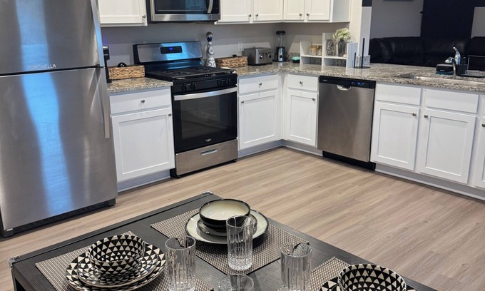 Enjoy your stay at a new construction home with modern interiors and cozy atmosphere. Free WiFi, Keurig coffee machine, fully equipped kitchen and outdoor BBQ grill. Three bedrooms with sleeping arrangements for up to 6 people.