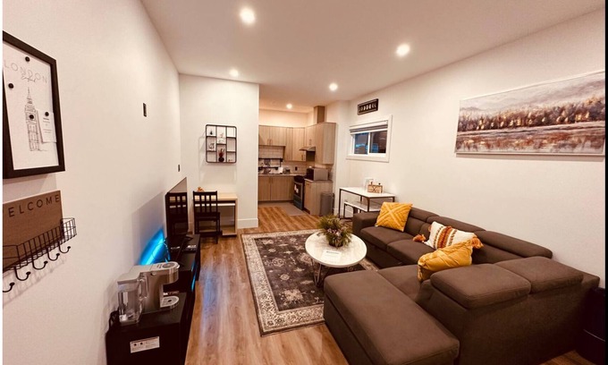 Perfect place for a stay for travellers, a person visiting for work or a small family visiting their friends & family. Suite has huge living room with open concept kitchenette with No Gas Stove, high ceilings, big bedroom with king bed, patio, separate entry, parking, keyless entry, great place for a relaxing stay.