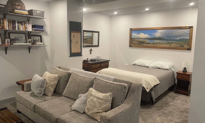fully furnished, cozy and clean Mother-In-Law Suite. 700+ Sq. feet of living space. Safe street parking, 2 Private entrances. Full kitchen. Full Bathroom. Dining area. Living Room, fireplace and Bedroom share a large area with 65" TV. Wifi and Utilities included. 30 day Rentals available.