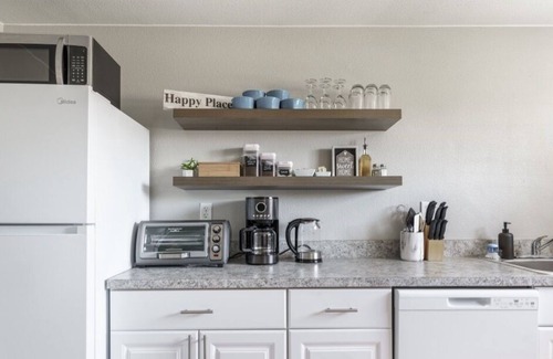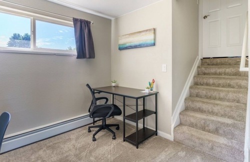 Upstairs there is a dining area that seats 6, a remote work space with office supplies, and a brand new kitchenette. The kitchenette is equipped with a new refrigerator and dishwasher, microwave, 2 hot plates, a toaster oven that also functions as an air fryer, pots and pans, coffee maker with all the coffee fixings, electric hot water heater with a wide variety of teas to choose from, along with cooking essentials like oil, salt, and pepper so you don’t have to buy your own. Note there is not oven, but it has everything else you will need!