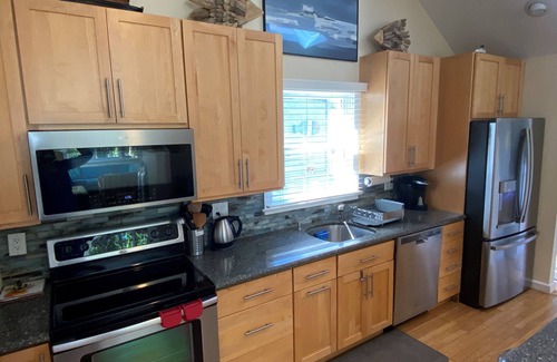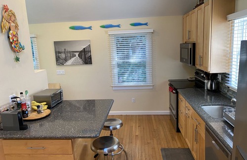 We had an HVAC system installed in 2021 that provides central air conditioning and heat throughout our home, making your stay comfortable anytime you choose to stay between April and November! The home features vaulted ceilings in the living room/dining room and kitchen with ample recessed and under-cabinet lighting, as well as a kitchen skylight. There is wood flooring throughout the house, natural maple cabinetry with a large pantry, granite counter tops - including a large kitchen island with seating for 2, stainless steel appliances, two large flat screen LCD HDTVs - one in the living area and one in the master bedroom, FIOS Fiber-Optic Cable Internet and Direct TV Satellite service, and overhead ceiling fans in every room, when you don’t want to use central air conditioning. In addition, there are plush mattresses, bed linens and towels, and a kitchen fully equipped with dishes, utensils, and kitchen supplies. The indoor laundry room, with a new Maytag full size washer and dryer, is right off the kitchen. There is no need to step outside to do your laundry.