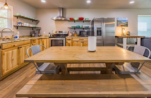 Escape to our 3BR, 2BA beachfront retreat on Lake Eufaula! Enjoy a stunning back porch with lake views, outdoor speakers, TV, grill, Blackstone, and more. Main bedroom with king bed and en suite. Fully stocked kitchen. Free gigabit internet, fire pit with s’mores, and games. Kayaks for rent. Near marina, water park, grocery store, and fishing tours. Sleeps 10, ample parking, EV charger. Book now for an unforgettable lakefront getaway!