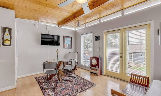 The main house is a super cute, sunny, 3 bedroom 1 bath in Austin's South Congress neighborhood. The spacious open floor plan with adjoining living room, dining room/kitchen, set up makes it the perfect place to entertain. The kitchen has new stainless steel appliances with double door fridge, gas stovetop/oven, dishwasher, and all the cooking utensils (plates, silverware, pots, pans, dishes, glassware etc.) you'll need.