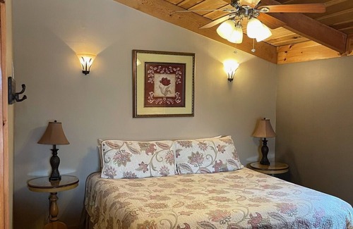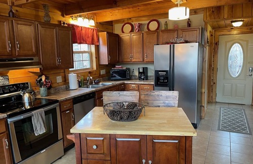 This property is a large two bedroom cabin with a spacious, open floor plan and a huge window wall. The king suite includes a large bathroom with full size shower, as well as a restful reading loft. The queen guest quarters also has an adjoining full bath. Both beds have high count cotton sheets, and fluffy towels for bathing. The kitchen is furnished with stainless steel appliances, fully equipped, and refrigerator provides filtered water and ice. We offer a flat screen TV over elegant gas fireplace, supplied by DISH/HOPPER. Outside, there is a private, sparkling hot tub tucked behind the house, plus a beautiful wrap around deck with umbrella table/cushioned chairs, and electric grill. There is also a fire pit in yard. All roads and driveway are paved to our front door. This conveniently located chalet is definitely your home away from home!