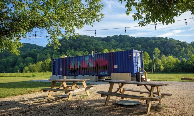 Embrace the essence of outdoor living with our unique riverfront glamping experience! During your stay, you will have access to our centrally located restroom facility, housed in a charming blue building just a short walk from your glampsite. Inside, you will find two clean and comfortable toilet rooms and two spacious shower rooms, ensuring convenience and comfort for all our guests.