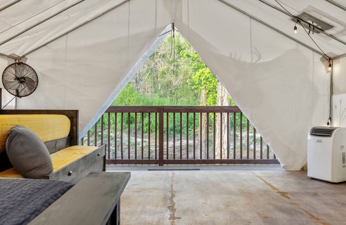 Experience pure relaxation within the enchanting shelter of a 320 SF Glamping Tent, nestled just a stone's throw from the tranquil waters of the Red River. The Dancing Deer beckons with its fully furnished sanctuary, boasting a king-sized bed, twin trundle bed, smart TV, fan, AC unit, coffee station, minifridge, microwave, internet access, firepit, grill, access to a bath house and an array of amenities. Despite the 10-minute drive to shops and restaurants, the area exudes a sense of serene seclusion.