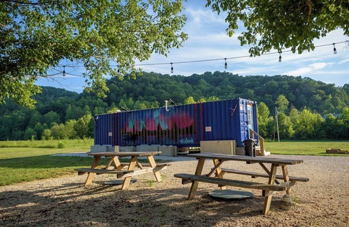 Embrace the essence of outdoor living with our unique riverfront glamping experience! During your stay, you will have access to our centrally located restroom facility, housed in a charming blue building just a short walk from your glampsite. Inside, you will find two clean and comfortable toilet rooms and two spacious shower rooms, ensuring convenience and comfort for all our guests.