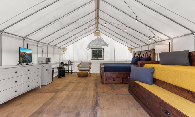 Experience pure relaxation within the enchanting shelter of a 320 SF Glamping Tent, nestled just a stone's throw from the tranquil waters of the Red River. The Dancing Deer beckons with its fully furnished sanctuary, boasting a king-sized bed, twin trundle bed, smart TV, fan, AC unit, coffee station, minifridge, microwave, internet access, firepit, grill, access to a bath house and an array of amenities. Despite the 10-minute drive to shops and restaurants, the area exudes a sense of serene seclusion.