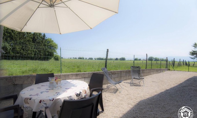 Single level quiet gîte (50 sq.m.), adjoining owners' house near farm. Gîte accessible to accompanied disabled people. Kitchen area opening onto sitting room and lounge area, 2 bedrooms (double bed, single bed) (2 single beds, crib). Shower room (washing machine). Central heating. Fenced garden, terrace with garden furniture. 10 min. from Gex (town steeped in history). Divonnes-les-Bains 15km (spa town, leisure centre, casino, golf course, cultural centre). Fixed charge for cleaning: 40€.