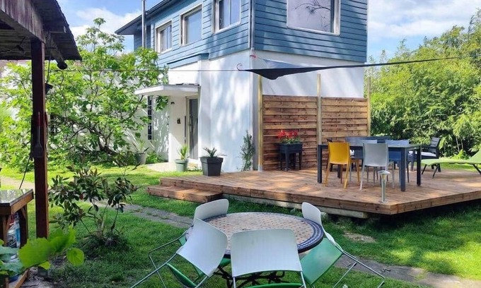 - Une terrasse privative avec salon de jardin et table d'extérieur.