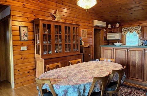 Spacious log home overlooking Keuka Lake. Stunning sunsets await in this all-season Finger Lakes retreat with magnificent views of the lake and its hillsides. Easy access (via ramp or a few stairs) to open floor plan common area of kitchen, dining, and living rooms with adjacent sun porch, deck, and 2 ensuite master bedrooms. Additional bedroom with attached full bath downstairs. Large deck with seating for 8 overlooks the yard and lake, the perfect spot for fun and relaxation. Fully equipped kitchen, a second refrigerator, washer and dryer, plenty of comfortable places to lounge, and full bathroom for each bedroom add comfort and convenience. Enjoy time on the property with a large lawn, meadow, and forest, with views of the adjacent vineyard. Central location with short drives to the Keuka and Seneca Lake wine trails, breweries, distilleries, museums, parks, golf courses, boat launches, as well as the charming towns of Hammondsport, Penn Yan, Geneva, and Watkins Glen. Ample parking. Plenty of amenities for the kids too including pack-n-play, children's mattress and cot, highchair, toys, games, and swing. Nearest swimming and lake access is not in walking distance but a short drive away in Penn Yan or Hammondsport.