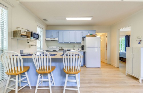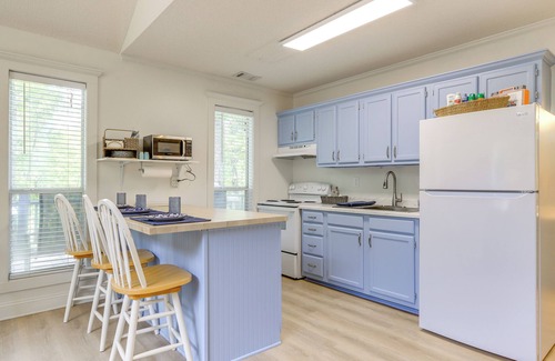 KITCHEN: Stove/oven, refrigerator, Keurig coffee maker, dishware + flatware, cooking basics, trash bags + paper towels, bar seating