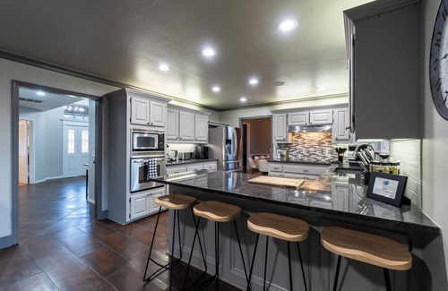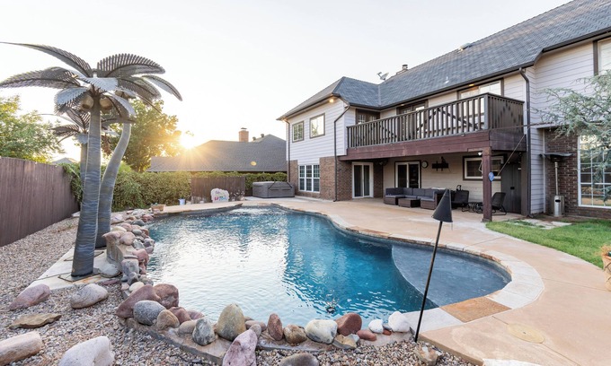 This cozy, contemporary 4,100 SQ FT Villa is located next to Gaillardia Country Club in the heart of OKC, next to some of the best restaurants/bars in the city. The home features THREE KING BEDS, SIX BUNK BEDS, A HEATED SWIMMING POOL, HOT TUB, POOL TABLE, FOOSBALL TABLE, BASKETBALL COURT, HORSESHOE and enough dining and sleeping quarters to accommodate 16+ guests! With FIVE bedrooms and loaded kitchen amenities, this is the perfect home base to host your next family getaway! Soak in the beautiful sunset views of Gaillardia Country Club with this hidden OKC gem!